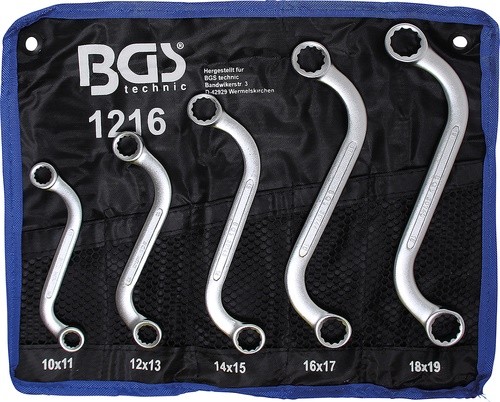 Set od 5 dvostrukih S-oblik okastih ključeva. Sadrži veličine: 10×11 mm, 12×13 mm, 14×15 mm, 16×17 mm, 18×19 mm