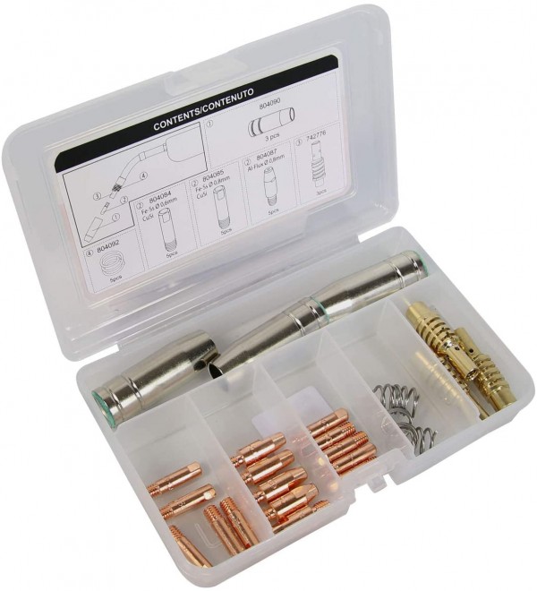 Telwin set pribora za MIG/MAG za MT15 804137 prikladan je za sljedeće modele aparata: – Telmig 200/250 – Mastermig 270 – Technomig 180/210/215/225 Set sadrži odgovarajuće dodatke i potrošni materijal za navedene aparate.